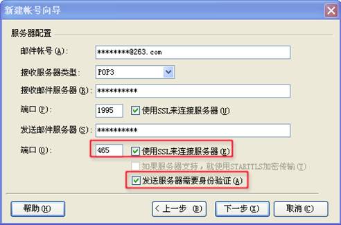 4. 点击下一步,在“服务器配置”页面,设置服务器信息,填写完整的邮箱帐号,