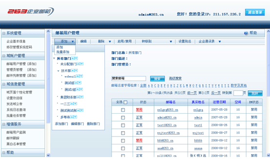 点击左侧菜单<域帐户管理>下的<邮箱用户管理>,进入邮件用户列表页面,如图5,可以对域内所有邮箱用户进行添加、修改删除等管理操作。