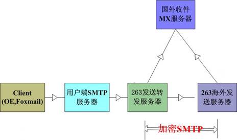 自建邮局用户发信,通过其smtp服务器发到263转发服务器,转发服务器采用加密方式发送到263海外服务器后根据收件人地址向国外收件MX服务器投递 。