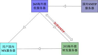 国外smtp服务器将邮件发送到263海外接收服务器,海外接收服务器采用加密方式发送到263转发服务器再向企业自建邮局MX服务器投递。