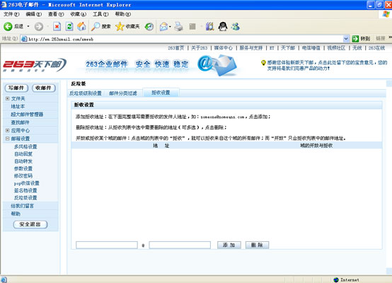- 开放或拒收某个域的邮件:点击“拒收”可以拒收来自这个域的所有邮件;点击“开放”只拒收列表中的邮件地址,不会对其同域的其他邮件拒收。